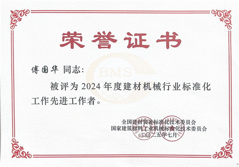 Dalam sesi penghargaan yang diadakan pada waktu yang sama, Quangong Machinery Co., Ltd dianugerahi gelar "Kolektif Tingkat Lanjut dalam Pekerjaan Standardisasi di Industri Mesin Bahan Bangunan pada tahun 2024", dan wakil manajer umum perusahaan Fu Guohua dianugerahi gelar "Pekerja Tingkat Lanjut dalam Pekerjaan Standardisasi di Industri Mesin Bahan Bangunan pada tahun 2024".
