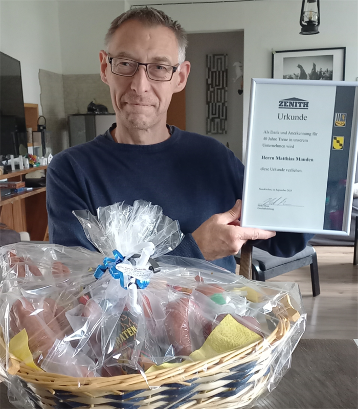 Bapak Markus Tü rk, yang berusia 47 tahun, juga merayakan hari jadinya yang ke-30. Dia menyelesaikan pelatihan juru tulis industri selama tiga tahun di Zenit dan saat ini menjabat sebagai kepala departemen penjualan suku cadang. Selama bertahun-tahun, ia telah memberikan dukungan purna jual yang efisien kepada pelanggan global dengan keterampilan bisnis yang kuat dan rasa tanggung jawab, memastikan pengoperasian sistem layanan perusahaan yang berkualitas tinggi.