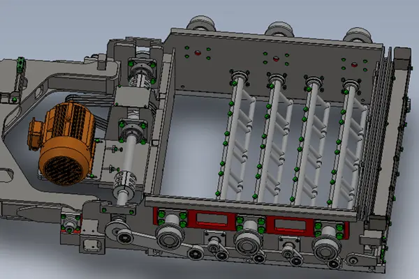 4Sistem Pemberian Makan yang Ditangguhkan Sistem pengumpan tersuspensi mengadopsi desain modular yang mengintegrasikan kotak pengumpan, pengikis, sikat tamper, dan unit pemecah lengkung. Kotak pengumpanan campuran muka dan campuran dasar dipasang pada rangka pengumpan, memungkinkan penggantian cepat dan kinerja pengumpanan optimal.